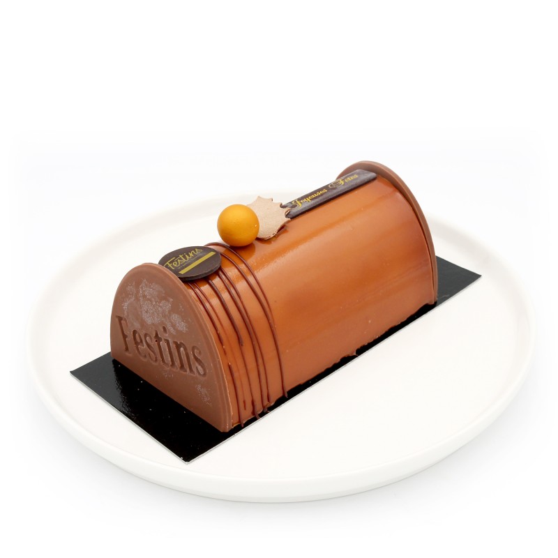 Bavaroise caramel, crémeux caramel au beurre salé, biscuit amande, croquant praliné, dés de poire vanillés, mousse poire.