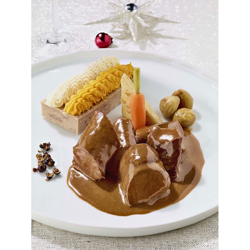 Râble de lièvre sauce Diane, gâteau de châtaignes, mousseline de carotte et céleri, légumes fanes