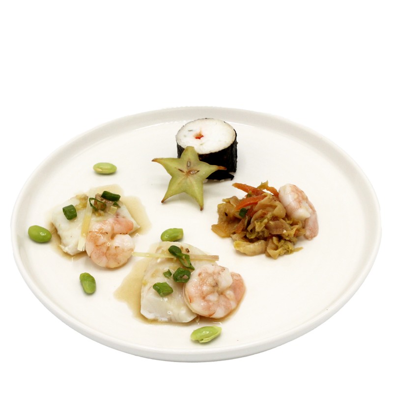 Cabillaud et crevettes, bouillon thaï, maki de riz aux cébettes