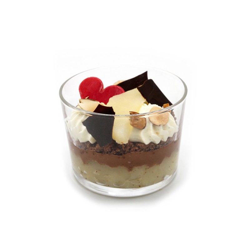 Poire, ganache tendre au chocolat, streusel chocolat et mousse vanille