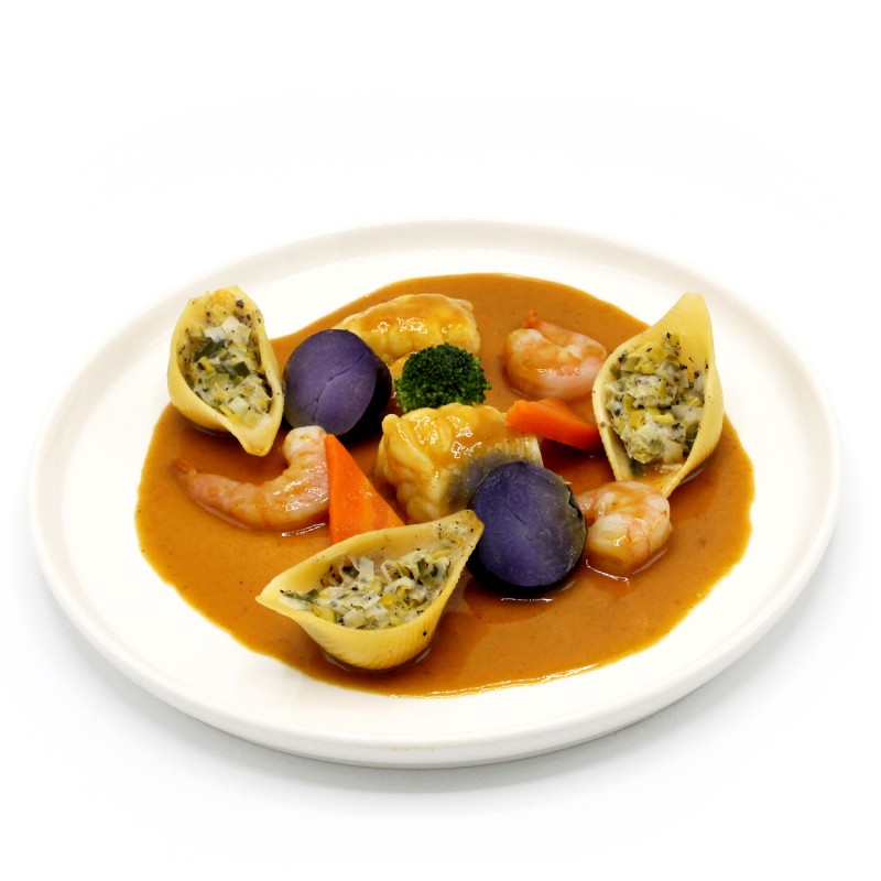 Lotte et gambas, jus de homard à l’huile de Nyons