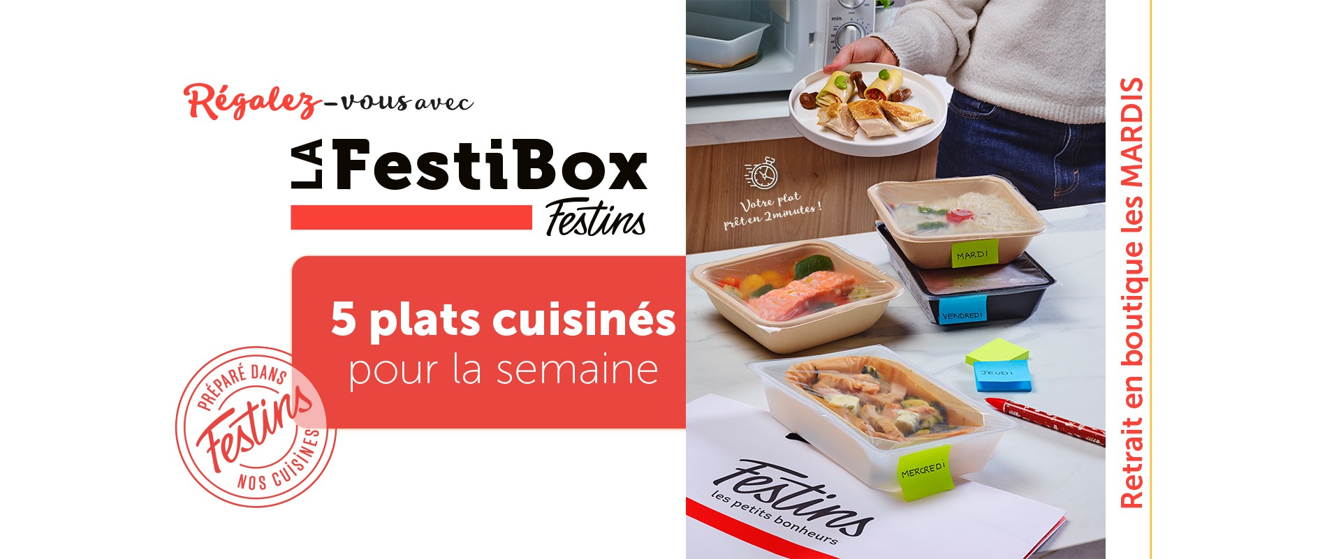 Menu de la semaine du Mercredi 12 novembre 2025Le mardi 11 novembre étant un jour férié, la boutique sera ouverte, mais exceptionnellement le rendu des FestiBox se fera le mercredi ! - Lasagnes à la bolognaise (Bœuf origine France) - Saumon, sauce vierge, épinards en crème de parmesan et pommes de terre - Risotto parfumé à la truffe, légumes d'automne -...