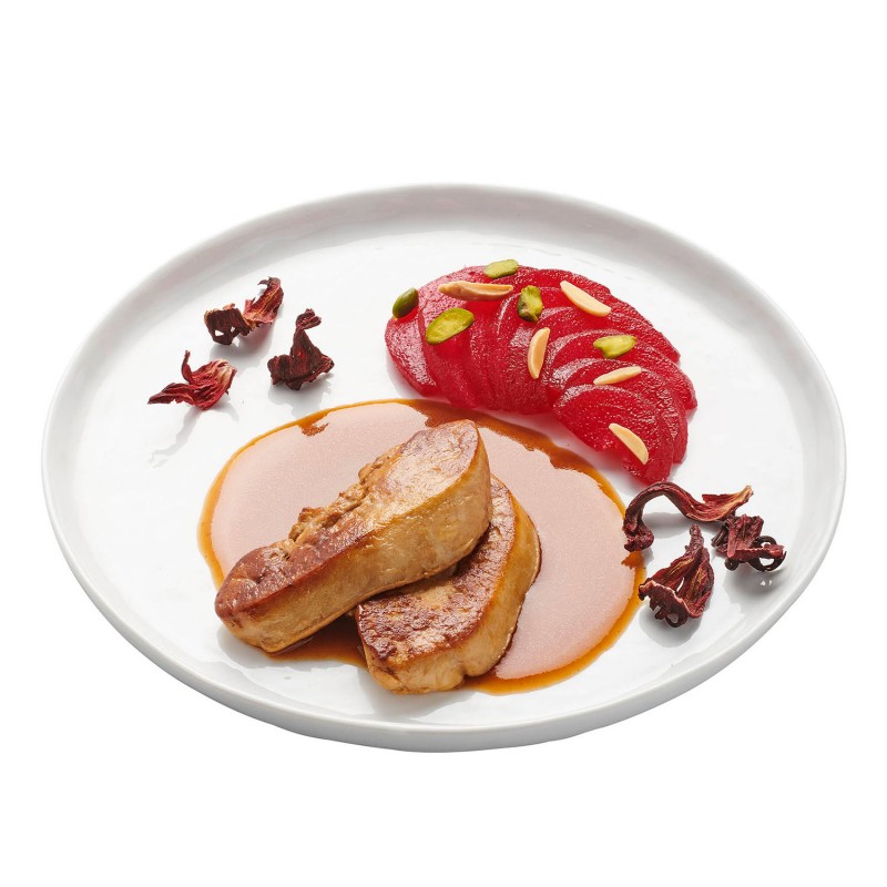 Foie gras poêlé, poire rôtie à la fleur d’hibiscus