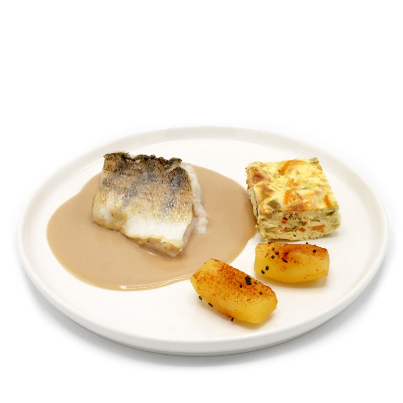 Sandre façon vallée d’Auge à la moutarde à l’ancienne, bavarois de poireaux, pommes gala